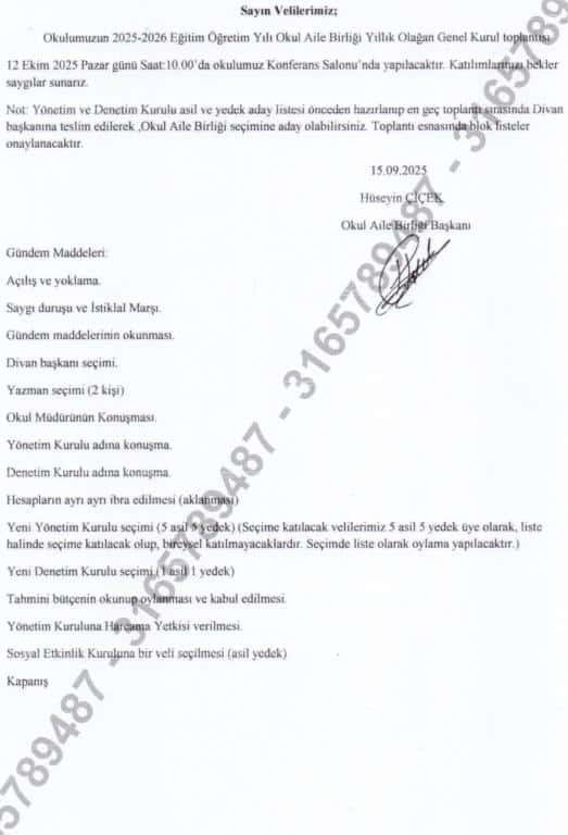 OKULUMUZUN 2025-2026 EĞİTİM ÖĞRETİM YILI OKUL AİLE BİRLİĞİ GENEL KURUL TOPLANTISI 12 EKİM 2025 PAZAR GÜNÜ SAAT 10:00 DA OKULUMUZ KONFERANS SALONUNDA YAPILACAKTIR.